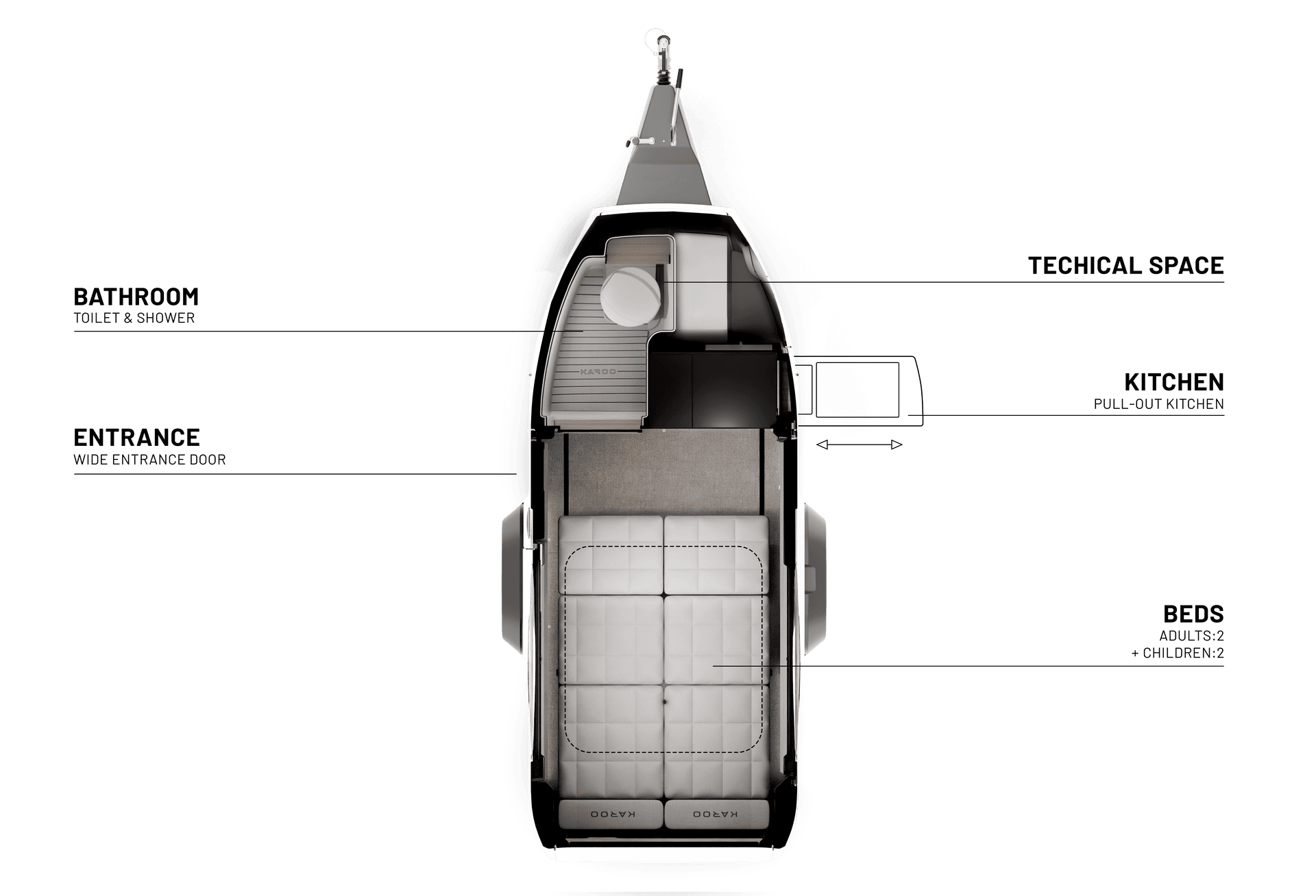 Karoo Adventure’s optimized shape improves aerodynamics, reducing air resistance compared to traditional caravans by 51 %. Together with the camper’s light build this cuts fuel consumption for both electric and combustion vehicles significantly.